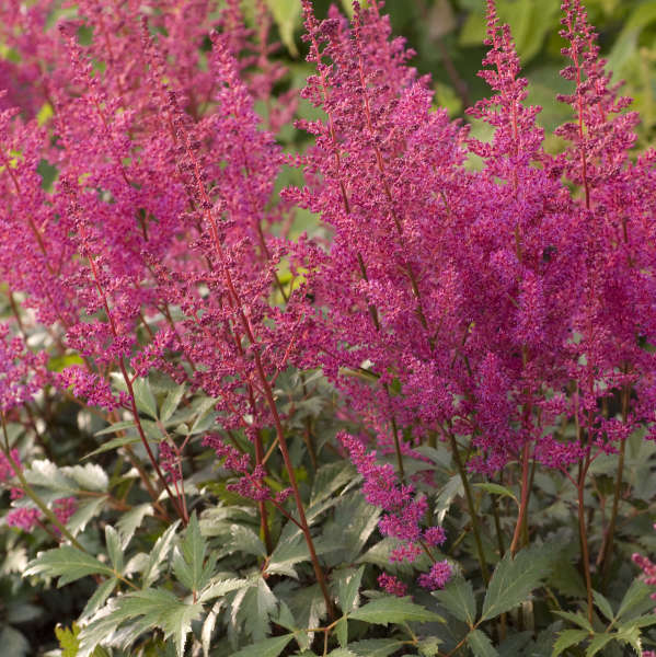 Рассада астильбы Арендса Элизабет ван Вин (Elizabeth van Veen) – сорт стойкого и привлекательного многолетника с ярко-красными побегами, усеянными мелкими нежно-фиолетовыми цветками. Соцветия длиной 20-25 см эффектно возвышаются над округлыми зелеными листьями с резной бахромой. Период цветения: июль-август, затем растение завязывает семена. Взрослая астильба похожа на миниатюрный куст с ромбовидной кроной. Сорт хорошо растет на любых участках, но на открытых и солнечных местах сокращается период цветения. Хорошо сочетается с другими растениями. Побеги устойчивы к болезням. Особенности астильбы Элизабет ванн Вин: