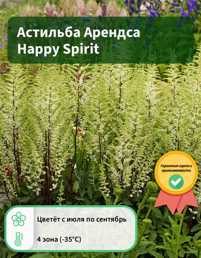 Астильба Арендса Happy Spirit - это волшебное растение, способное преобразить ваш сад в настоящий райский уголок. Ее стебли достигают высоты до 100 см, а диаметр цветков может достигать 80 см. Цветки белые с красным черешком, создают неповторимый вид и придают уникальный шарм вашему саду. Листья зеленые, форма листьев оригинальная, что делает это растение еще более привлекательным.