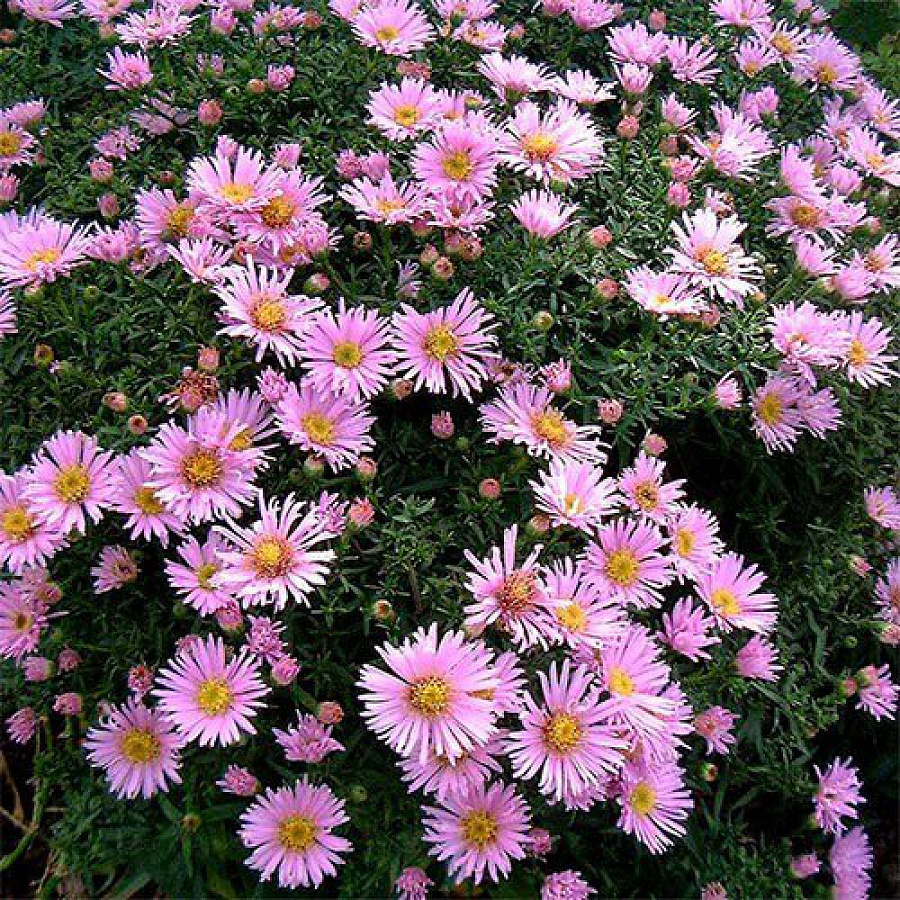 Рассада астры кустарниковой Peter Harrison отличается морозостойкостью и способностью быстро разрастаться, занимая большие площади. Это многолетнее растение представляет собой полушаровидный ветвистый куст, на котором в августе появляются многочисленные цветы с розовыми лепестками и желтой серединкой.