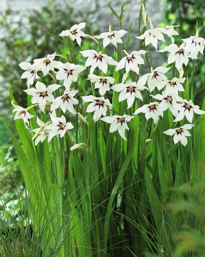 Луковицы ацидантеры Мюриэла (Acidanthera murielae) вырастают очень красивыми цветами, привлекающими изысканным видом и характерным, нежным ароматом. На любой клумбе, в саду или палисаднике становятся настоящей жемчужиной, заметной издали. Многолетник вырастет примерно до 90 сантиметров высотой. Листья внешне похожи на гладиолусные, но более утонченные и нежные. Растение долго стоит в срезке, до недели сохраняя свежий вид. Цветет однократно, но обильно, крупными (около 12 сантиметров диаметром) бутонами белого цвета с темной сердцевиной. Любит влажные, рыхлые почвы.