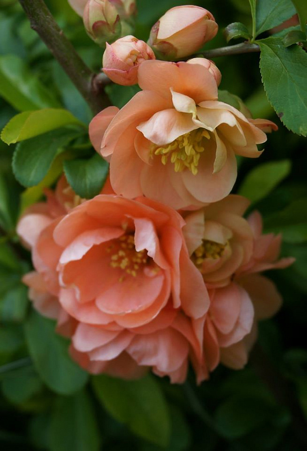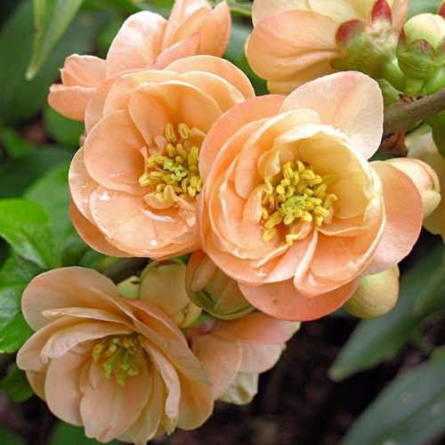 Айва великолепная камео - это удивительное растение с изысканным лососевым цветом цветков и желтыми плодами. Ее ствол обладает небольшим количеством шипов, что делает ее безопасной для окружающих. Растение достигает высоты 100-120 см, что делает его идеальным для альпинариев, групповых посадок, живых изгородей или одиночных посадок.