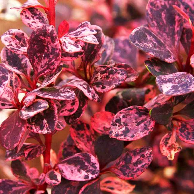 Саженцы Барбариса Тунберга Harlequin (Арлекин) имеют пурпурно-красный эффектный цвет, а молодой прирост имеет розовый штрих по листу, чем привлекает к себе повышенное внимание. Раскидистая крона с течением времени меняет цвет на пурпурно-коричневый. После опадания листьев кустарник будут украшать многочисленные плоды небольшого размера, до 10 миллиметров, красного цвета.