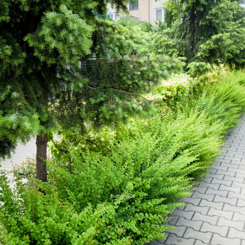 Саженцы кустарника барбариса Зеленый ковер (Green Carpet) это невообразимо красивый сорт, который впервые был выращен в Голландии. Высота растения составляет 50 см, а диаметр доходит до 1,2 метров. Часто крупномер барбариса Зеленый ковер используется с целью подбивки кустарников большой высоты в качестве яркого акцента в композиции сада. Живая изгородь, созданная при помощи этого сорта барбариса, радует взор в течение круглого года: летом – это блестящая глянцевая листва, а в зимний период – плоды красного цвета. Цветение кустарника начинается в мае-июне. на нем появляются одиночные или собранные в соцветия цветы. Внутри они желтого цвета, а сверху красные, располагаются по всей длине побега. Плоды растения созревают в сентябре, они блестящие и продолговатые, их много, они имеют красный и розовый оттенок. Плоды продолжают украшать куст даже после опадания листьев осенью и порой держатся всю зиму. Сорт Зеленый ковер очень любит освещенные участки и хорошо переносит засуху. Также он неприхотлив к плодородию почвы, но лучше развивается на щелочном грунте. Растение отлично приживается в условиях городских парков.