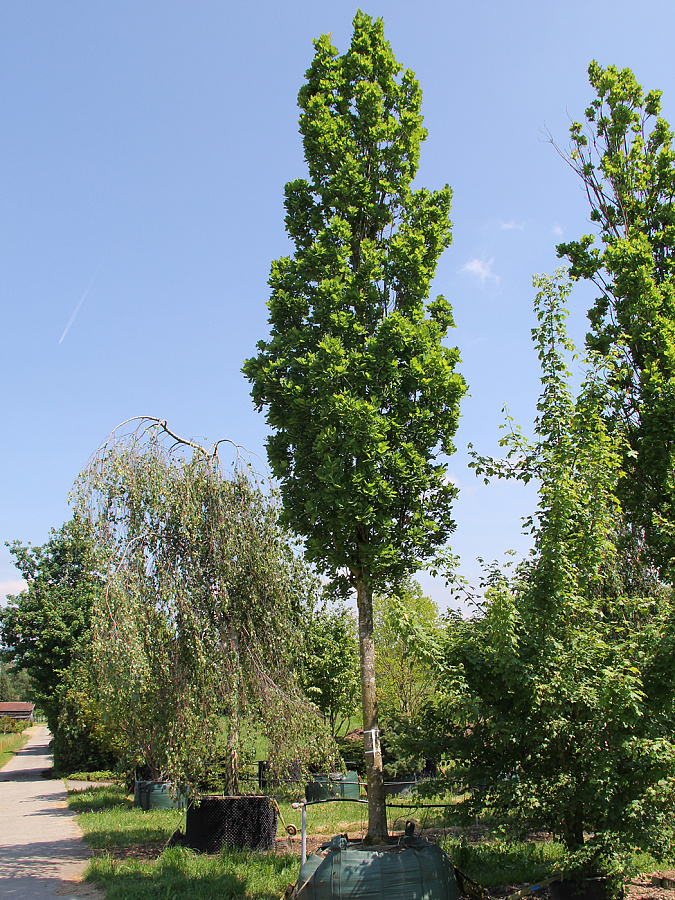 Саженцы Дуба черешчатого Фастигиата (Fastigiata, Quercus robur) – лиственное дерево с узкой, колоновидной, темно-серой кроной и гутыми неукоснительно вертикальными ветвями. Вырастает высотой до 15 метров с диаметром 5-метров. Живет больше века. Цветение обычно в мае незначительными цветками. А в июле-августе идет созревание плодов в виде желудей.