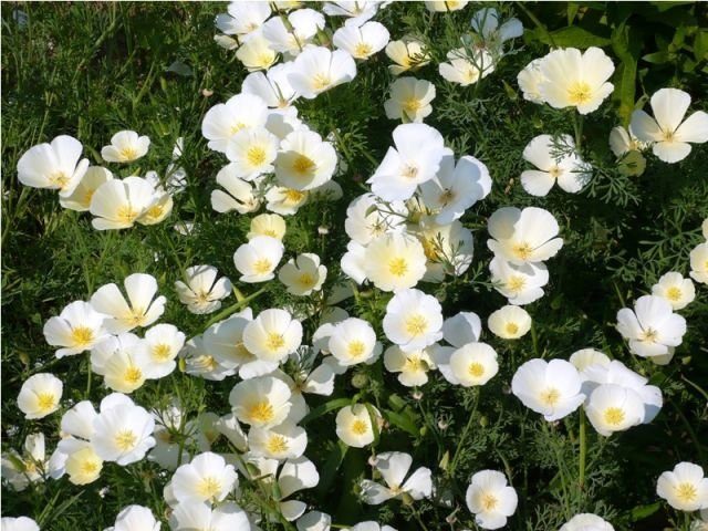 Семена эшшольции калифорнийской сорта Белый замок порадуют садоводов эффектным видом выращенного экземпляра. Компактный куст с серебристо-зелеными побегами и белыми чашевидными цветами отлично впишется в любую садовую композицию. Цветение продолжится с июня до октября.