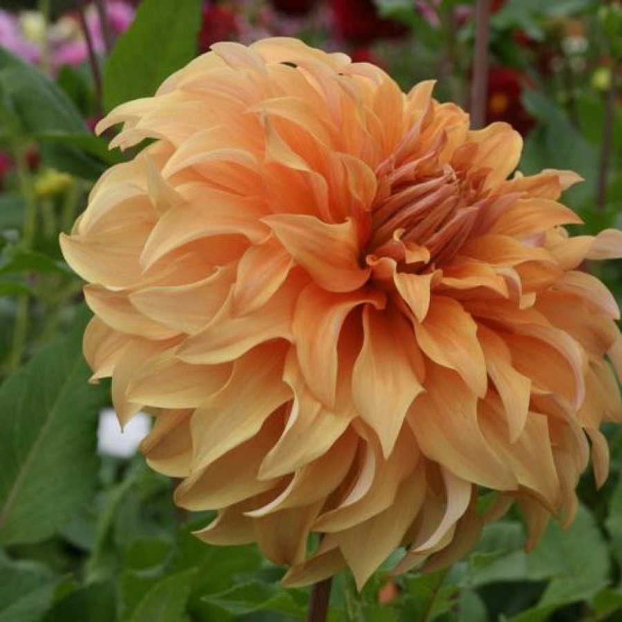 Луковицы георгины Геркулес (Dahlia Hercules) отличаются нежной, оранжево-лососевой окраской бутонов. Кажется, будто по клумбе раскинулось теплое пламя. Растут георгины быстро, любят плодородные грунты и теплые, безветренные места. Высота взрослого куста доходит до 90 сантиметров. Прямостоячий стебель выбрасывает до десяти цветоносов одновременно. Благодаря этому растение декоративно на протяжении лета. Цветы большие, примерно 20 сантиметров диаметров, потрясающей оранжево-лососевой окраски. Используются для создания ярких пятен на клумбе, хорошо стоят в срезке.