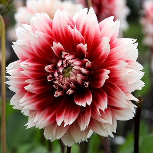 Саженцы и рассада декоративной георгины Ред энд Вайт Фубуки (Dahlia cultorum) — одно из новых достижений голландской селекции. Её сразу заметно в любом саду, так горят малиновым окрасом крупные шаровидные цветы. Этот насыщенный цвет удачно подчёркивают беленькие кончики многочисленных лепестков. Да и само растение выделяется мощным, высоким стеблем, вырастающим до 120 см.