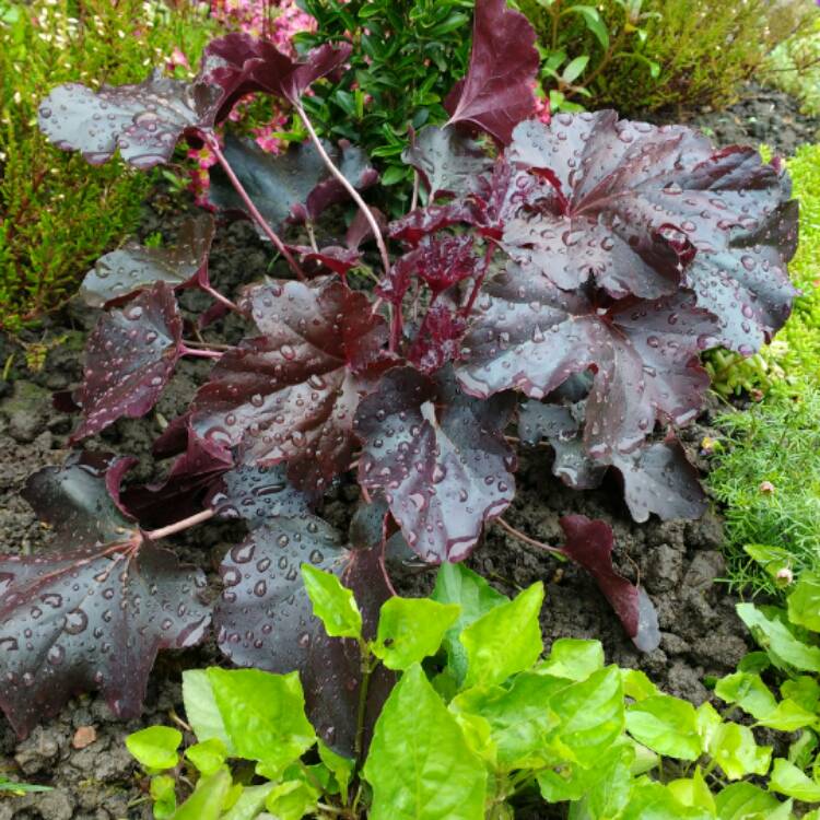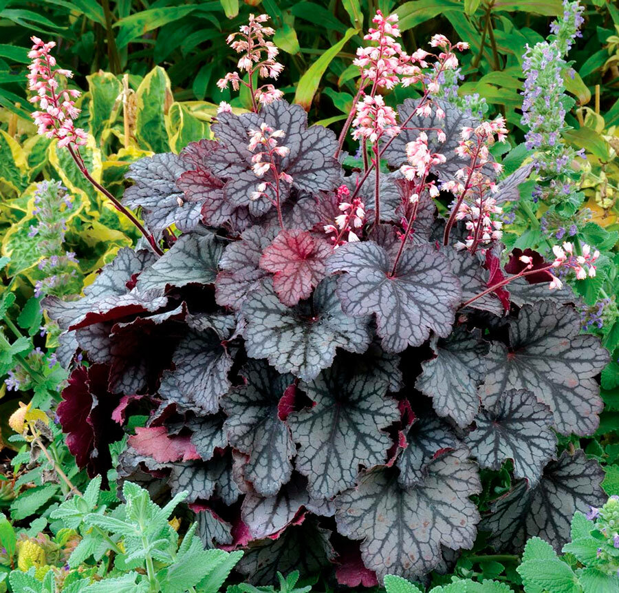 Рассада гейхеры Дарк Мистери (Dark Mystery) украсит любую смешанную клумбу или послужит материалом для эффектной одиночной посадки. Особенностью сорта является необычная форма и расцветка листвы: гофрированные листья имеют пурпурно-коричневую окраску. На протяжении всего лета растение цветет мелкими кремовыми цветочками. Многие начинающие садоводы приобретают рассаду гейхеры Дарк Мистери (Dark Mystery) из-за неприхотливости и простого ухода. Растение нужно поливать по мере высыхания почвы. Переувлажнение становится причиной развития мучнистой росы, серой гнили и других заболеваний.