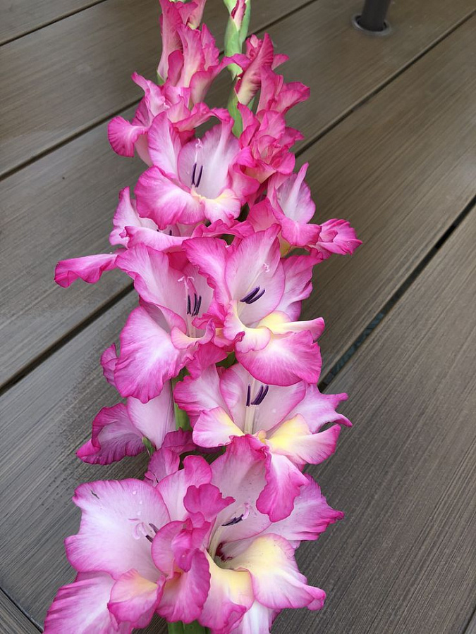 Луковицы гладиолуса гибридного Greyhound высаживаются в прогретую увлажненную почву. Рекомендуемая глубина лунок 10-15 см, а расстояние между ними – до 30 см. Сорт неприхотлив и популярен среди цветоводов. Высота растения варьируется от 50 до 150 см. С конца июня – начала июля до сентября вершину гладиолуса гибридного Greyhound украшает колосовидное соцветие из прекраснейших цветов. Лепестки голубовато-розовые с яркими кораллово-розовыми гофрированными краями и редкими штрихами у основания. Этот сорт отлично смотрится в одиночных посадках, высадках большими группами и в смешанных цветниках.