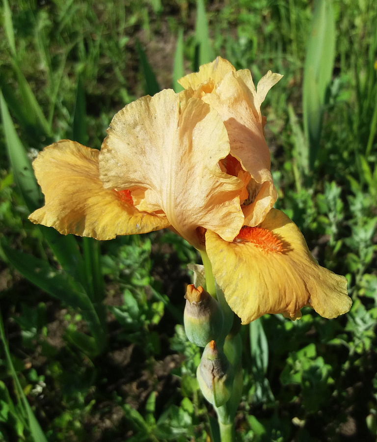 Ирис бородатый Skyfire - это настоящий огненный шторм в вашем саду! Ярко-оранжевые цветы с коричневыми прожилками будут словно пламенем, разгорающимся на фоне зеленых листьев. Это растение поражает не только своей красотой, но и своей изысканной формой листьев, которая придает ему особый шарм и уникальность.