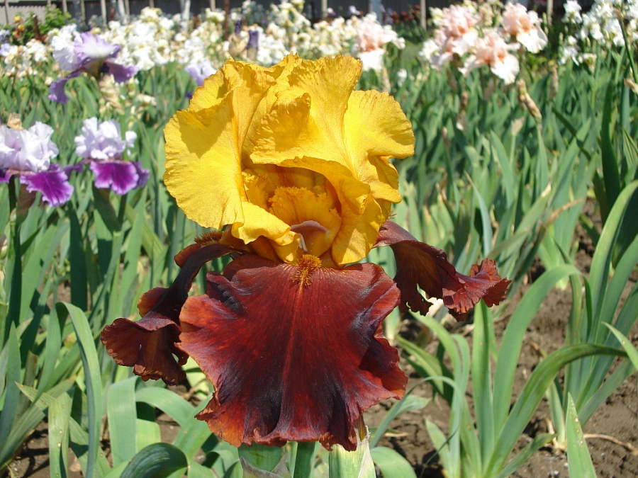 Ирис бородатый суприм салтан - это великолепное растение, которое поразит вас своей красотой и изысканностью. Его верхние лепестки оранжевые с бордовыми прожилками, а нижние темно-бордовые, создавая неповторимый контраст. Высота растения может достигать до 100 см, а размер цветка до 15 см, что делает его по-настоящему величественным. Листья зеленые, форма листьев уникальна и привлекательна.