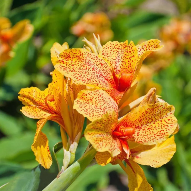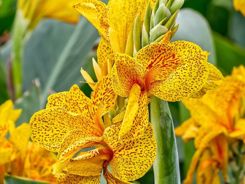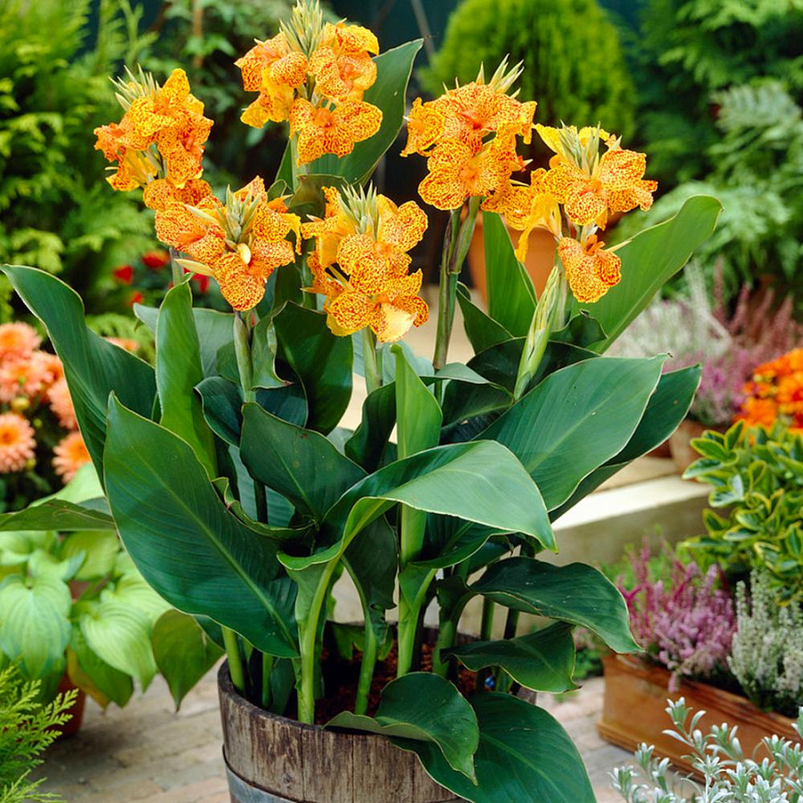 Канна зеленолистная Picasso - это великолепное растение, которое поразит вас своей красотой и изысканностью. Ее ствол прочный и прямой, достигает высоты до 70-90 см, что делает ее идеальным выбором для групповых или одиночных посадок. Листья этой канны имеют зеленую окраску в течение всего сезона, создавая яркий контраст с ярко-желтыми цветками с красным крапом, которые расцветают в июле.