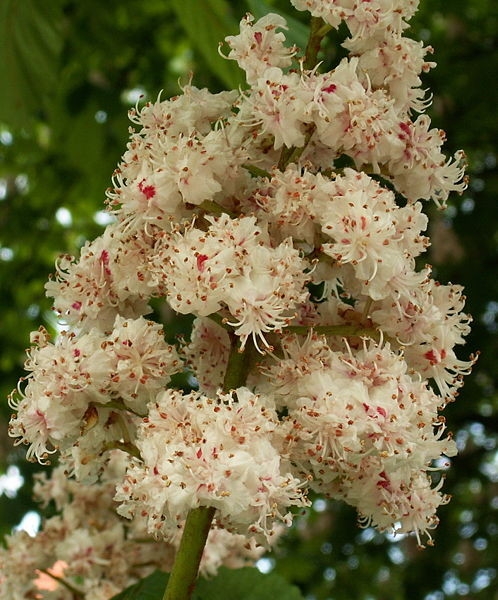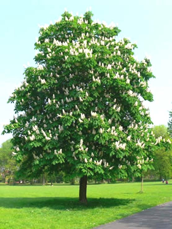 Саженцы Каштана конского обыкновенного (Aesculus hippocastanum) – аккуратное дерево, с раскидистой густой кроной, способное достигать 25 метров в высоту. Имеет крупные листья, похожие на веер, состоящий из 5-7 листочков, каждый из которых может быть около 15-30 сантиметров в длину. Цветы будто собраны в пирамидки из множества соцветий и отличаются своим окрасом: на бело-розовых лепестках имеются желтые вкрапления, которые со временем меняют свой цвет на красный. Каштан конского обыкновенного имеет плоды, которые похожи на колючую круглую коробочку, внутри нее имеется крупное семя. Способен произрастать как в солнечной местности, так и в тени; предпочитает суглинистые, рыхлые почвы. Суровые зимы каштан переносит трудно – способен подмерзать, а вот в средней полосе России зимует спокойно.