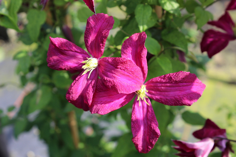 Саженцы клематиса гибридного Мадам Джулия Корревон (Madame Julia Correvon) высаживают на солнечные участки, защищенные от ветра и сквозняков. Наиболее подходящая для выращивания почва - суглинок, со слабокислой или нейтральной реакцией среды. Цветки у клематиса гибридного Мадам Джулия Корревон (Madame Julia Correvon) винно-красные, диаметром 8-12 см. Цветет обильно и продолжительно с июня по сентябрь. Применяется для озеленения беседок, стен, оград и заборов. Подходит одиночных и групповых посадок, например, между кустарниками хвойниками не требующих сильной ежегодной обрезки.
