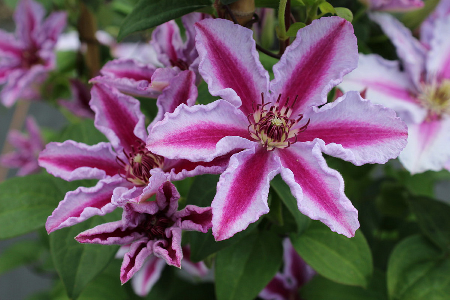 Саженцы клематиса гибридного Тюдор (Tudor) отличаются неприхотливостью, морозостойкостью, а так же ранним, продолжительным и обильным цветением. Лиловые цветы с продольными пурпурными полосами, начинают распускаться в мае-июне, повторно растение зацветает после летней обрезки в июле-августе. Диаметр венчиков колеблется в пределах 8-12 см. Цепляясь за опоры листовыми черешками, декоративная лиана способна подняться на высоту 150-200 см. Клематис гибридный Тюдор (Tudor) подходит для выращивания рядом с беседками, арками или карликовыми деревьями и миниатюрными кустарниками.