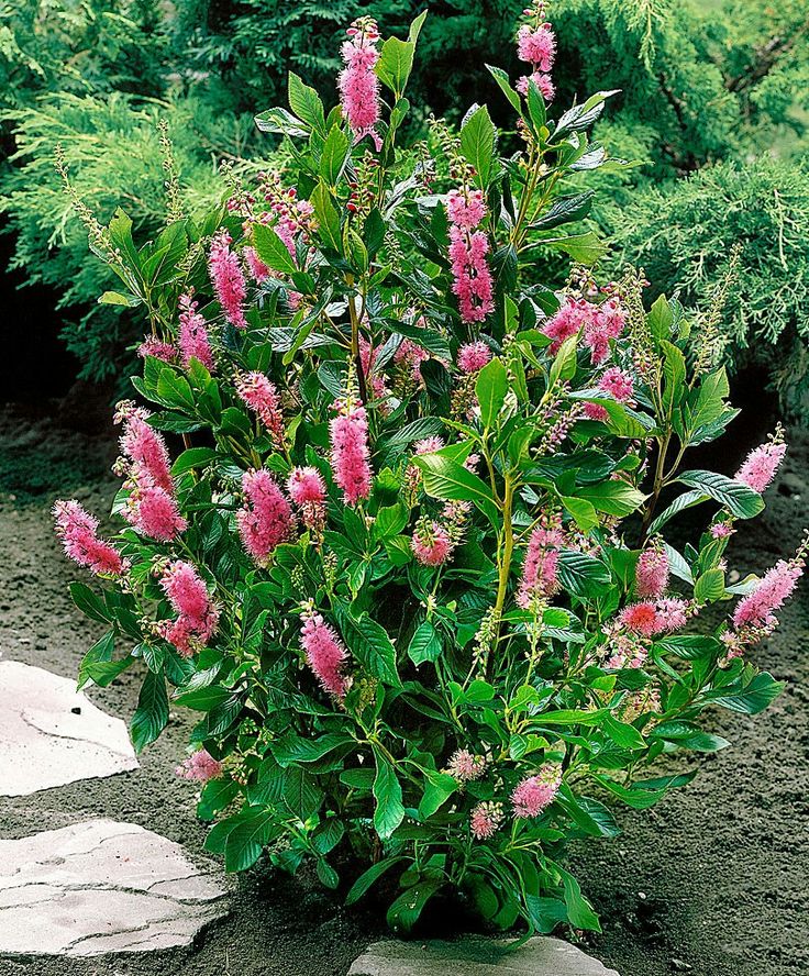 Саженцы клетры ольхолистной Пинк спайр (Clethra alnifolia, Pink Spire) покупают ценители цветущих декоративных кустарников. Высота взрослого растения достигает 2 метров. В июле растение распускается розовыми душистыми цветами, собранными в высокие соцветия, которые радуют красотой до сентября. Листва ребристая, зеленая, осенью приобретает желтый оттенок и долго не опадает. Сорт предпочитает хорошо освещенное солнцем, уютное место. Используется для формирования живых изгородей, защитных полос в саду. Растение морозостойкое, но в первые годы нуждается в укрытие на зимовку.