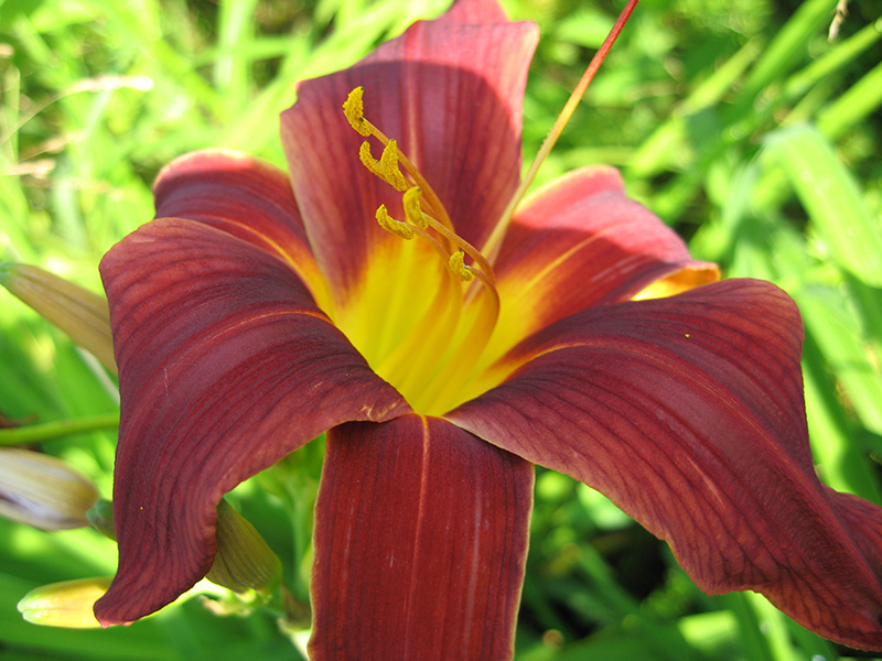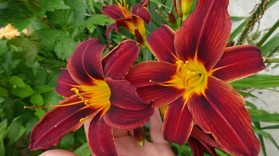 • Окраска цветка : темно-бордовый с желтым горлом, диаметр цветка 12см