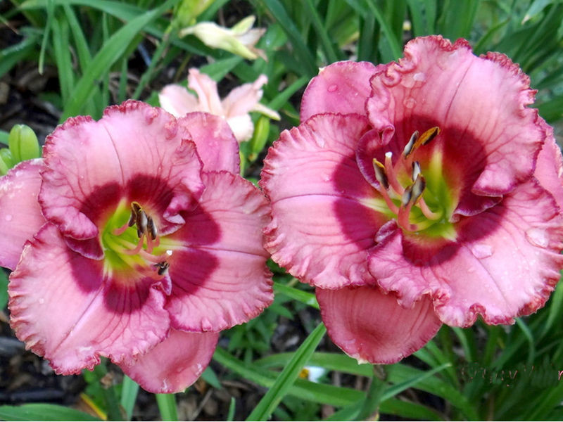 • Окраска цветка : розовый с красным глазком и зелёным горлом