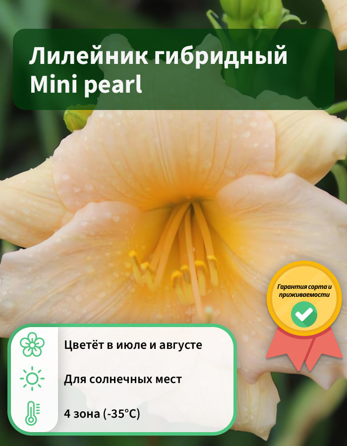 Рассада лилейника гибридного Mini pearl порадует потрясающим видом роскошных кустов, на которых летом распускаются крупные цветы с бежево-желтыми лепестками. Высота взрослых растений достигает 50 сантиметров. Этот сорт отлично смотрится самостоятельно и в сочетании с другими декоративными растениями. Цветы можно срезать для составления нежных букетов. Рассада лилейника гибридного Mini pearl предпочитает плодородную, рыхлую, в меру увлажненную почву с хорошим дренажем, но при необходимости растение легко адаптируется к любым условиям. На 5-7 год кусты следует разделить и рассадить.