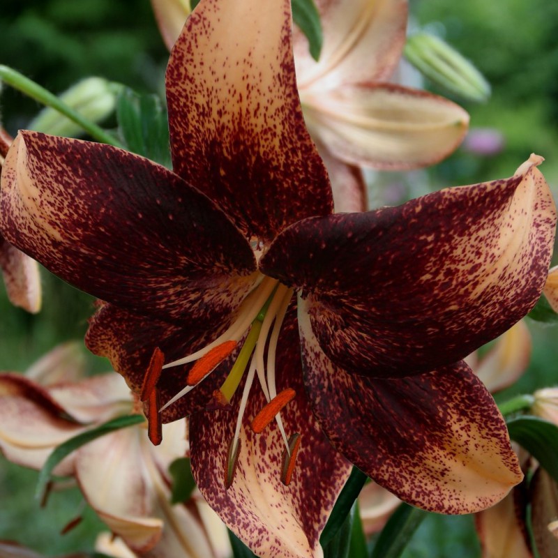 Луковицы лилии азиатской Танго Чоклат Ивент станут находкой для садовода-новичка, так как вся сортовая серия отличается неприхотливостью. А уж в период цветения они по-настоящему украсят сад, сделав его ярким и праздничным. Довольно высокое растение быстро достигнет 100 сантиметров. Внешняя часть лепестков окрашена в светло-желтый оттенок, густо покрыта бордовыми крапинками. В центре лепестки становятся практически полностью темно-бордовыми. При полном раскрытии эффектно смотрятся и ярко-оранжевые пыльники на светлых тычиночных нитях. Элегантная лилия прекрасно будет себя чувствовать на солнечном месте.