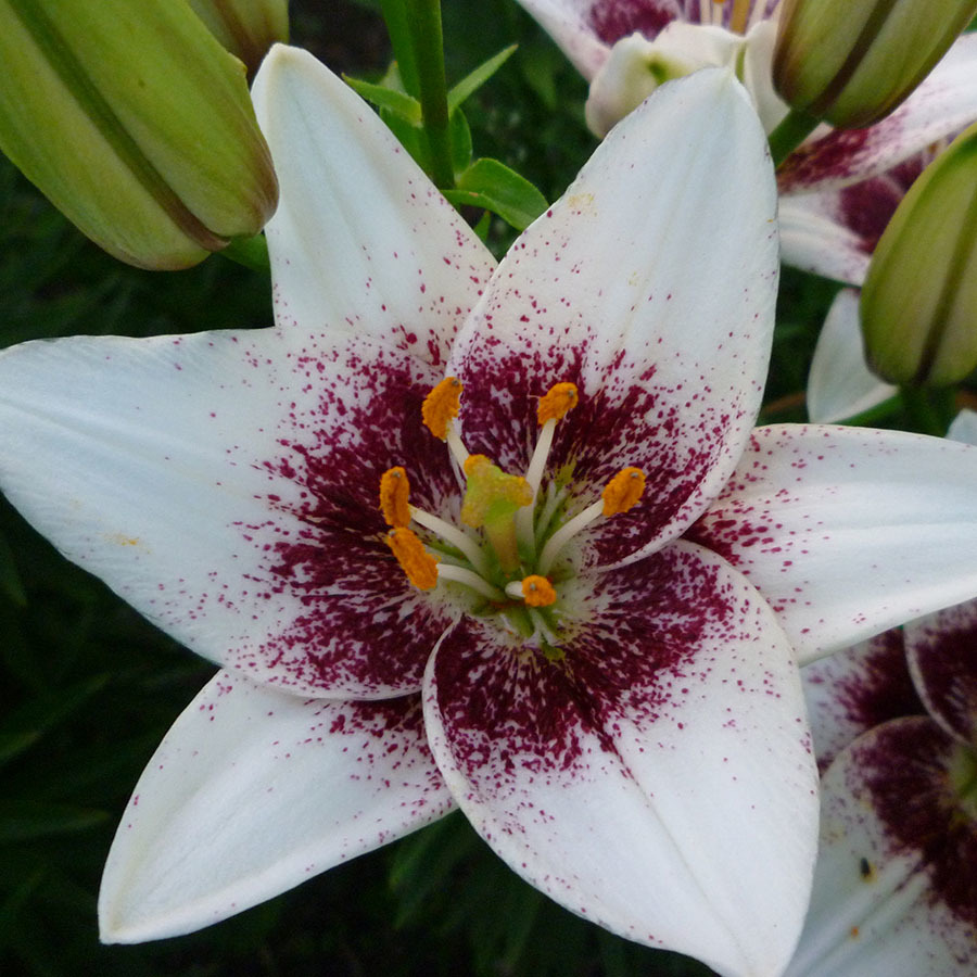 • Окраска цветка : белый с густым вишневым крапом до середины лепестков