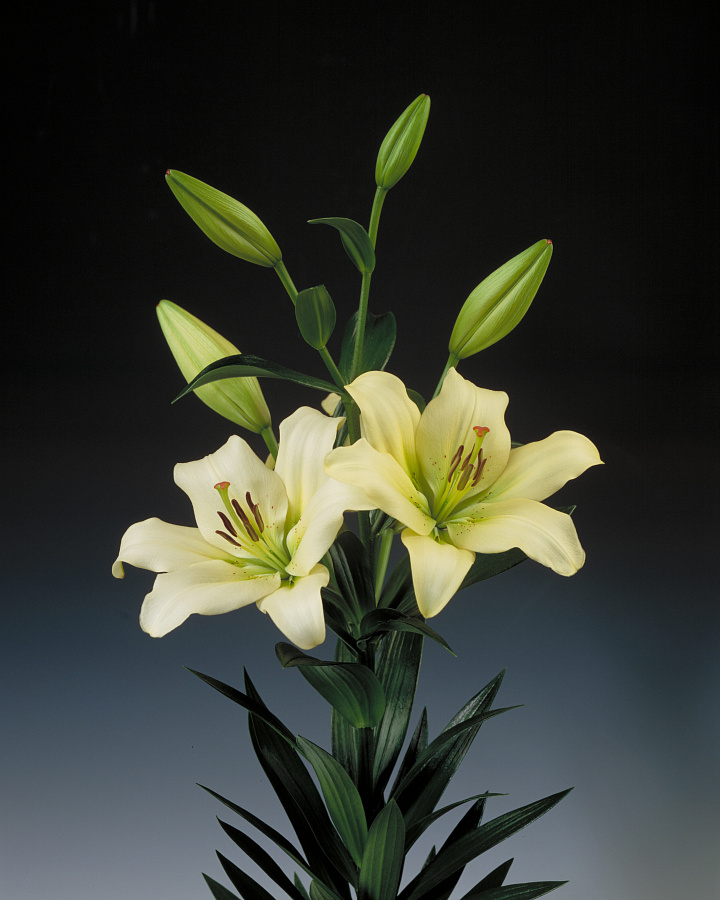 Цветки имеют диаметр 20 см, тонкий нежный аромат и белую расцветку с кремовым оттенком. Ближе к центру окраска лепестков становится светло-зеленой, и появляется мелкий крап. Лепестки с загнутыми кончиками, слегка волнистые. Цветение наступает в июле. Этот зимостойкий сорт является одним из лучших для выгонки.