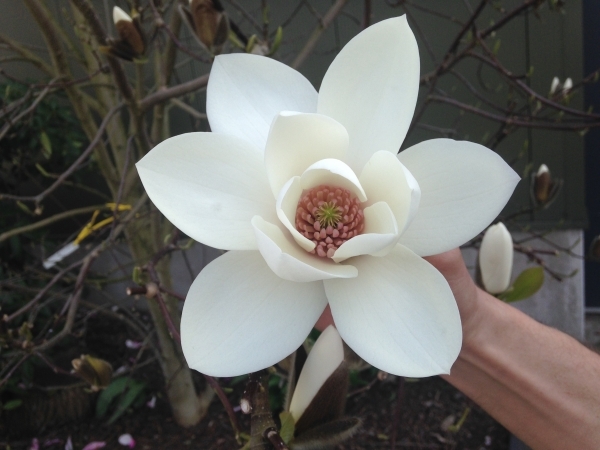 Саженцы Магнолии Джули Помпон (Joli Pompon) – небольшое деревце, которое отлично впишется в солнечный сад. Сорт считается редким, ведь он выведен недавно. Большие цветки в 15 сантиметров отличаются от остальных магнолий своим белым цветом. Сердцевина украшена светло-розовыми тычинками. Внешне соцветия похожи на хризантемы. Примечательно, что аромата практически нет. Дерево с круглой и разветвлённой кроной вырастает до 2-4 метров. Такой размер будет через 10 лет после посадки. Магнолия, как и остальные виды этого растения, любит солнце. Но стойко переносит морозы до минус 24 градусов. Корни плохо реагируют на известковую почву.