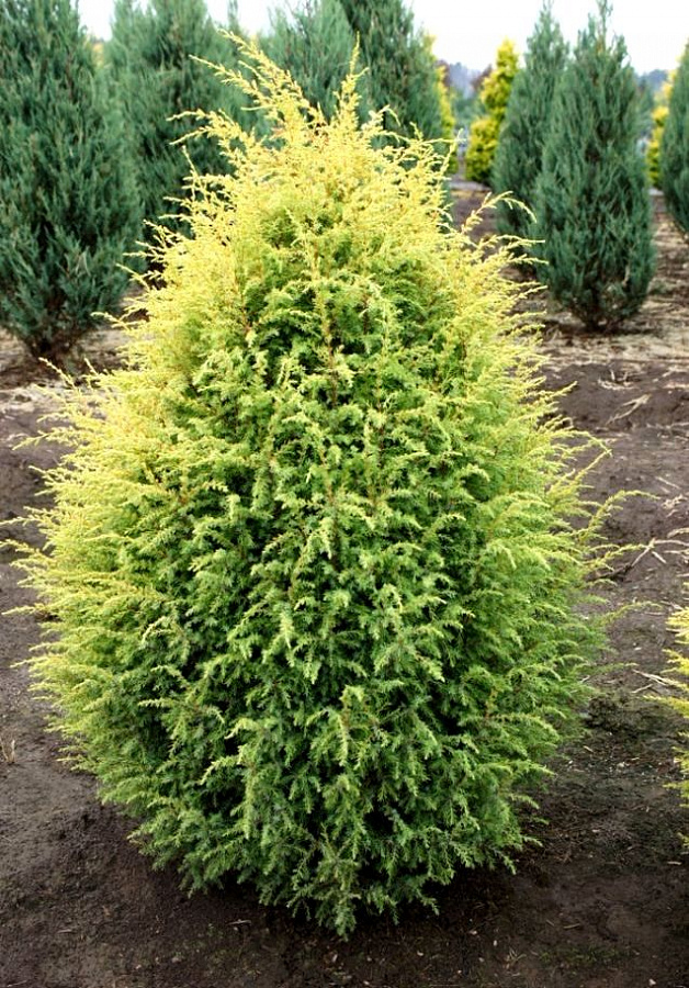 Саженцы можжевельника обыкновенного Голд Кон (Gold Cone) и крупномеры сорта имеют яркую золотисто-желтую хвою, что объясняет его название и популярность у садоводов. Красивый вечнозеленый кустарник с узкоконической кроной высотой до 200 см. Получил широкое распространение в ландшафтных композициях и групповых посадках на газонах, а также используется для оформления террас и балконов. Особенности ухода: