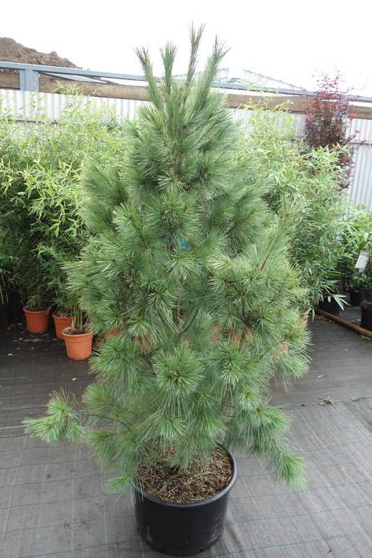 Саженцы Сосны гималайская Валлиха Данза (Densa Hill, Pinus wallichiana) – высокое, стройное растение. Его высота достигает до 7 метров. За год прирост составляет 15-20 сантиметров. Крона плотная, пышная, колоновидной, немного ассиметричная, диаметром до 250 сантиметров. Уникальность сорта в его иголочках, длина которых около 10 сантиметров, голубовато-зеленого окраса, тонких, свисающих с веток. Шишки прорастают вертикально, молодые-фиолетового оттенка, зрелые – коричневые. Этот сорт сосны является долгожителем. Его продолжительность жизни – до 300 лет. Он хорошо выдерживает морозы, растет в светлых и слегка притененных местах. Растение боится затяжной весны.