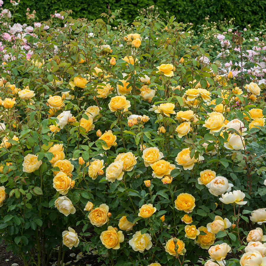Рассада розы кустовой Грэхэм Томас (Graham Thomas): сорт притягивает взгляды яркими желто-оранжевыми цветами и манит сладким душистым ароматом. Сорт получил имя в честь известного садовода. Куст имеет прямую форму с сильно ветвистыми побегами. Махровые цветы розеточного типа демонстрируют изумительный желто-оранжевый оттенок. Побеги могут слегка поникать под тяжестью цветов, поэтому куст можно вырастить, как плетистый. Высота взрослого растения 120 см. После цветения образуются плоды с семенами. Особенности розы Грэхэм Томас: