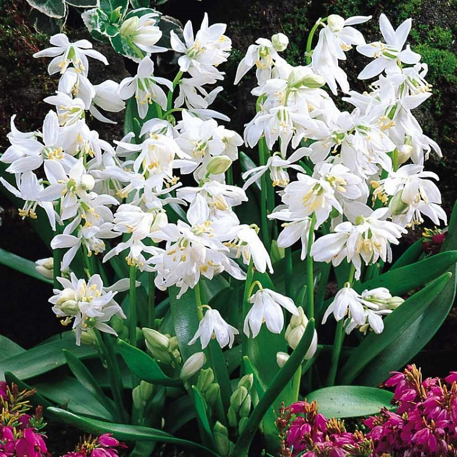 Луковицы сциллы Альба (Alba) превосходный посадочный материал для ваших участков, дающий ранние цветы. Цветет это нежное растение небольшими белыми колокольчиками в соцветиях размером до 8 сантиметров, распространяя нежнейший аромат. Высота кустов всего лишь 15 сантиметров.