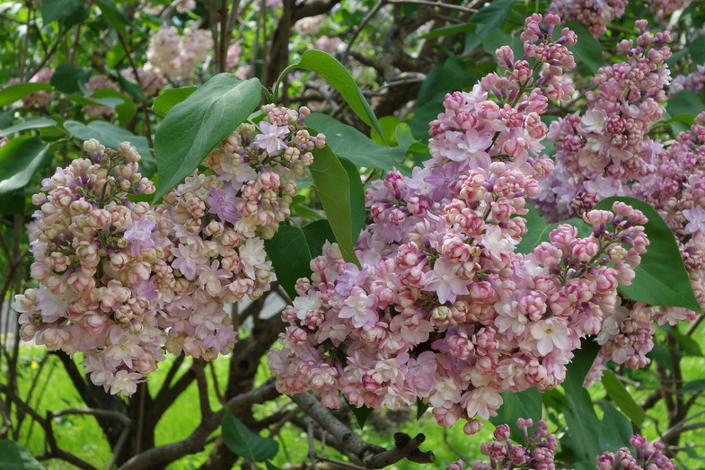 Сирень Память о Вехове очень красива, ее соцветия огромные, достигают 25 сантиметров. Цветки махровые, тесно расположенные друг к другу. Окрас довольно причудлив: из темно-фиолетового бутона распускаются розоватые цветки в конце мая-начале июня.