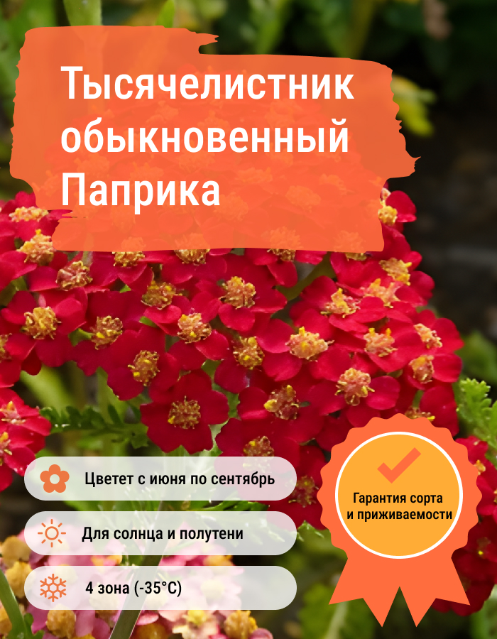 Рассада тысячелистника обыкновенного Паприка (Paprika) подарит участку красиво цветущий многолетник, который к тому же является отличным медоносом. В период цветения появляются корзинчатые соцветия, которые в свою очередь объединяются в щитки. В каждой корзинке крайние язычковые цветочки — женские, а внутренние трубчатой формы — обоеполые.